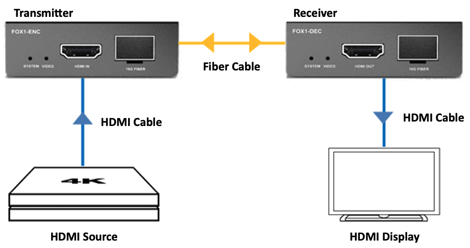 Similar to HDMI over twisted pair applications, fiber-based extenders leverage a transmitter and receiver pair to convert electrical signals into optical signals and back again.